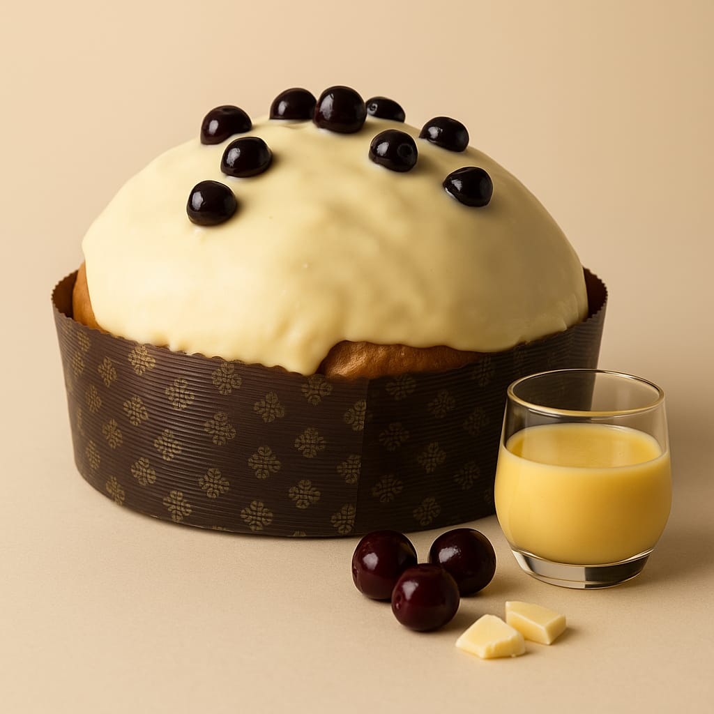 Ingredienti: farina di grano tenero di origine Italiana Tipo 00, burro, zucchero, tuorli d'uova fresche (allevate a terra in Italia) amarene candite, lievito naturale (frumento), liquore allo zabaione (18% di grado alcolico), miele, panna fresca, malto d'orzo, sale, aromi naturali, estratto di vaniglia.